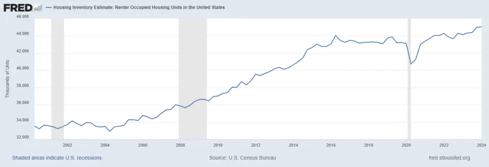 Since its peak in the mid-2000s, home ownership has been significantly dropping, and it will continue to drop as millennials, and aging baby boomers choose to stay mobile in the 21st century.