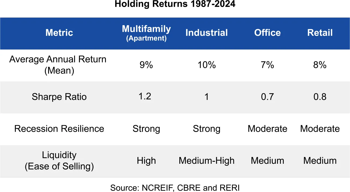 This combination of steady cash flow and long-term appreciation makes multifamily a top choice for investors looking to maximize returns while minimizing risk. With a Sharpe Ratio of 1.2, multifamily real estate offers superior risk-adjusted performance compared to stocks and other commercial real estate investments.